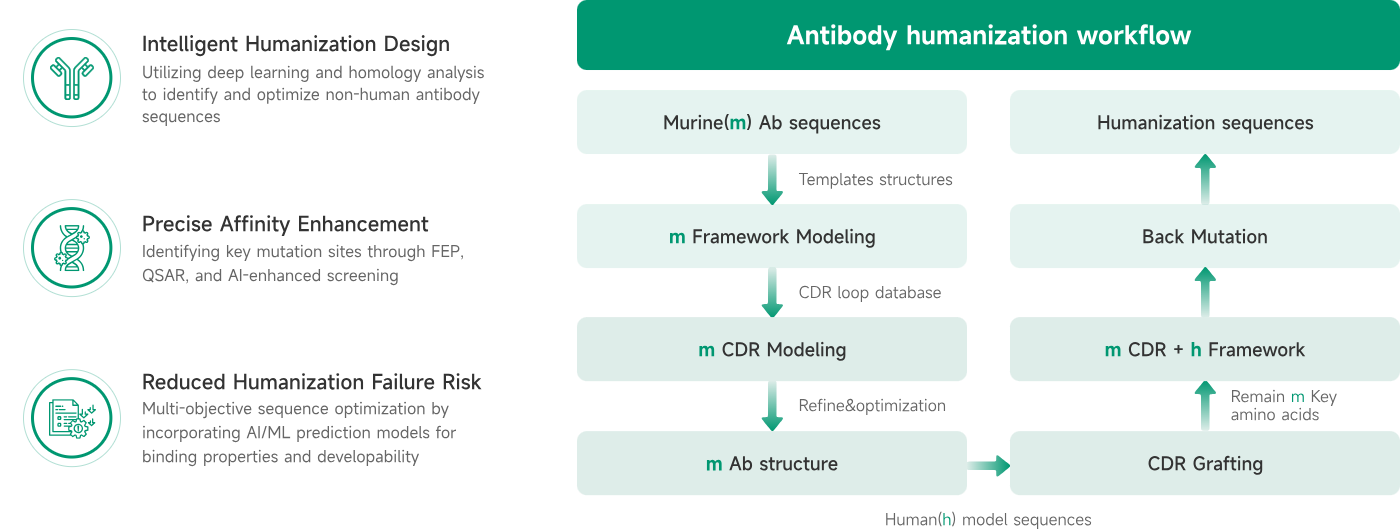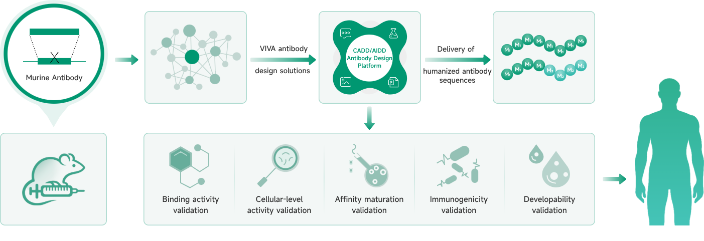 Through the antibody humanization solution on the VIVA Antibody Design Platform, we redesign murine antibodies, enabling them to maintain activity at both the molecular and cellular levels.