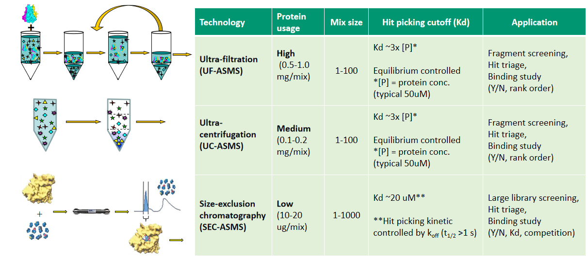 Affinity Selection Mass Spectrometry (ASMS) is a rapid and flexible screening platform, which can screen any soluble protein targets and compound libraries. Compared with other mainstream screening technologies, ASMS screening platform does not rely on radioactivity, fluorescent labeling or enzymatic activity, is more rapid, flexible, with higher throughput, and is more cost-effective. It is suitable for a wide range of screening forms and conditions, and can screen targets that are difficult for traditional screening methods. In the application of ASMS screening technology, there is no need to label or to immobilize the protein, so as to avoid affecting the state of the protein due to labeling or immobilization. As an unbiased screening method, ASMS can directly detect hits without the interference of other components in the sample, suitable for the discovery of allosteric binding compounds. The Viva ASMS platform has been widely recognized by our customers. There are three different ASMS technologies available at Viva, which can be used to meet the needs of wide range of drug discovery projects.