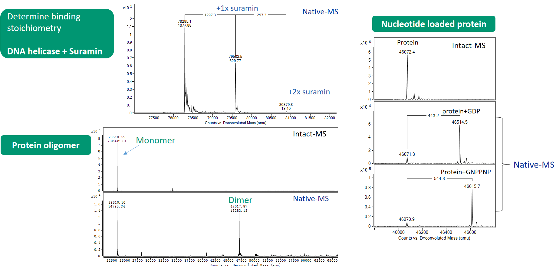 Native mass spectrometry (Native-MS) is a technique for studying protein complexes, interactions between proteins, and interactions between proteins and ligands. This technique preserves the natural folding state and associated non-covalent interactions of biomolecules in MS (mass spectrometry) analysis. Viva Biotech's Native-MS technology can be used to identify the non-covalent binding between compounds and target proteins and determine the chemical ratio of the binding components (stoichiometry).